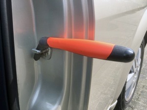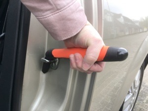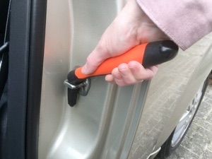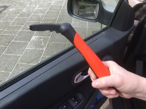 Sla het zijraam in de hoek met de scherpe punt van de EASY - EXIT GRIP met een harde slag kapot